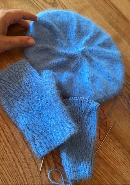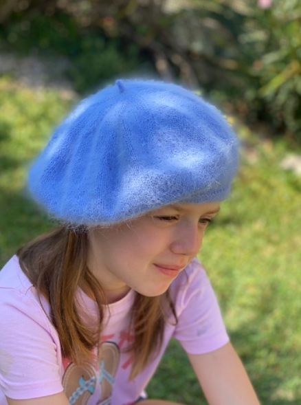 Realizzato in tondo senza cuciture, il basco parte dal bordo ed è lavorato con avvio provvisorio all’uncinetto e filo di scarto a contrasto. Il bordo in maglia rasata viene lavorato doppio, piegato e unito all’avvio. La lavorazione prosegue con aumenti regolari su 8 sezioni, poi in altezza senza aumenti e infine con diminuzioni fino a 4 maglie, utilizzate per creare il codino decorativo in i-cord.